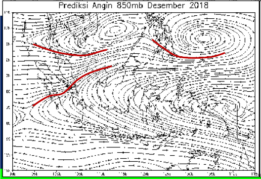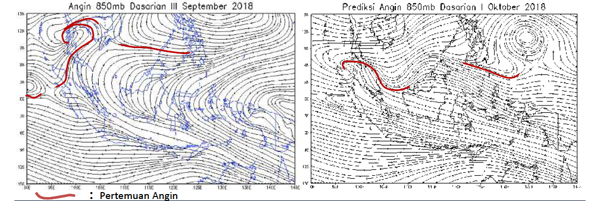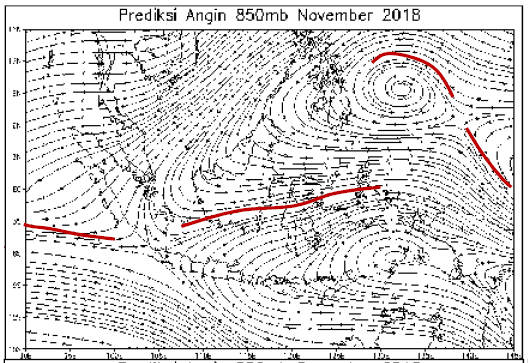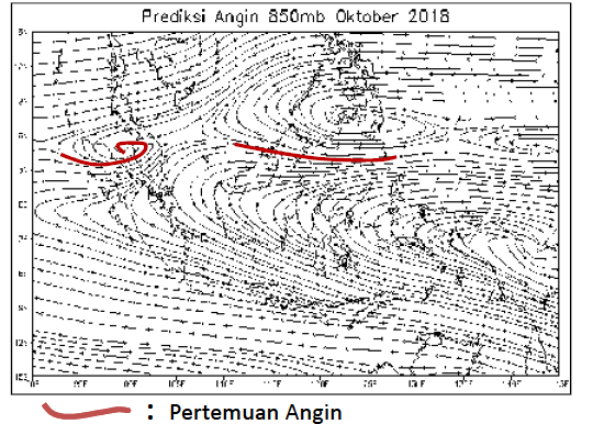 Berdasarkan informasi angin bulanan pada lapisan 850 mb dari Badan Meteorologi Klimatologi dan Geofisika, diprediksikan bahwa pada Oktober 2018 akan terdapat potensi pertemuan angin di Sumatera Barat hingga Selat Malaka serta di bagian utara Pulau Kalimantan dan Sulawesi. Sementara itu, pada November 2018 dorongan angin dari utara sudah membendung Angin Monsun Timuran dari Australia sehingga terjadi potensi curah hujan tinggi di selatan Sumatera, Jawa, Bali, NTT, NTB dan Kalimantan. Sementara itu, pada Desember 2018 diperkirakan terdapat pertemuan angin di sekitar Sumatera Tengah, Kalimantan Bagian Utara, Sulawesi dan Maluku serta Papua.