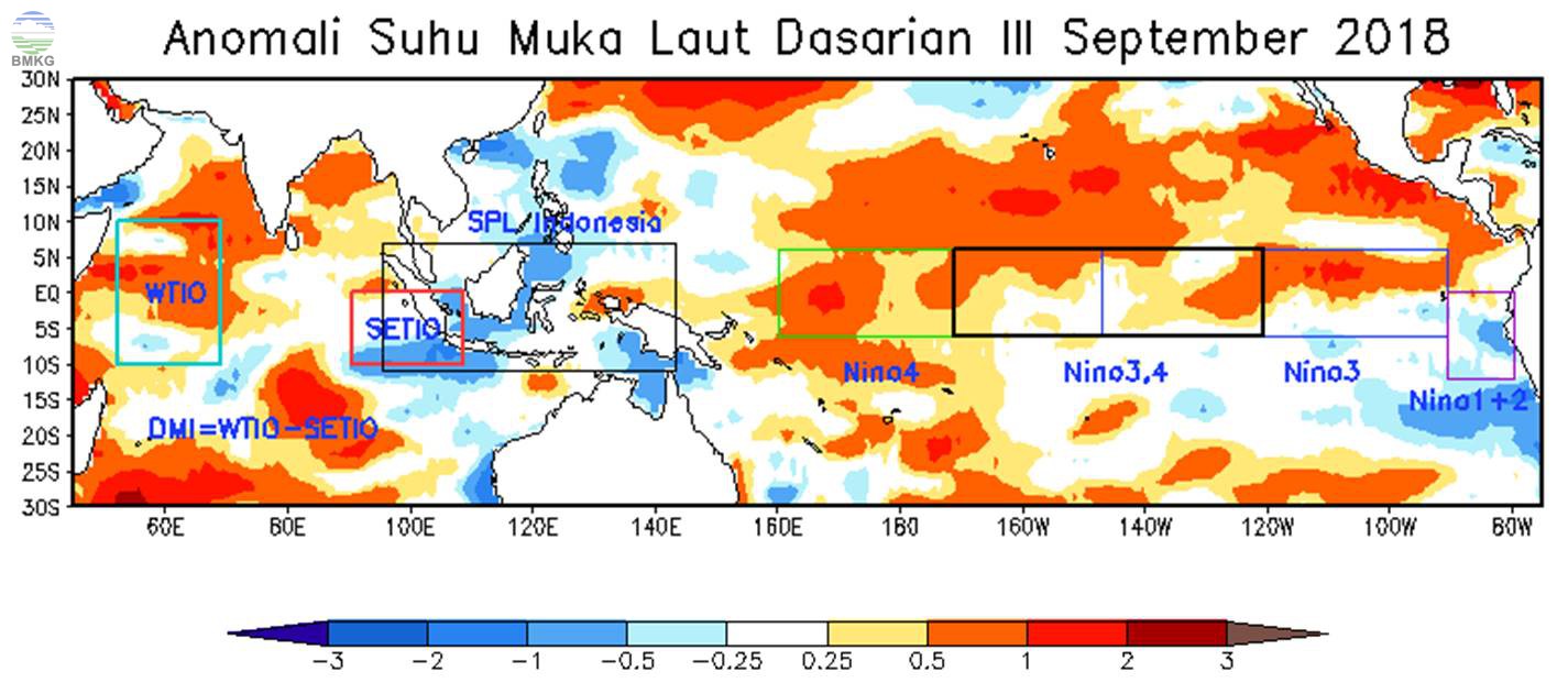 Selain pola sirkulasi angin regional, kondisi iklim di Indonesia juga dipengaruhi oleh kondisi geografis serta hubungan antara kondisi daratan dan lautan. Salah satu metode untuk menganalisis dan menduga pola sirkulasi angin sebagai akibat adanya kondisi geografis (dalam hal ini lautan) adalah melalui pengukuran anomali suhu muka laut (sea surface temperature). Berdasarkan data anomali suhu muka pada dasarian III (10 hari terakhir di bulan September 2018), diketahui bahwa terbentuk zona suhu hangat di perairan sebelah utara Aceh, barat Sumatera Bagian Utara, serta utara Papua.