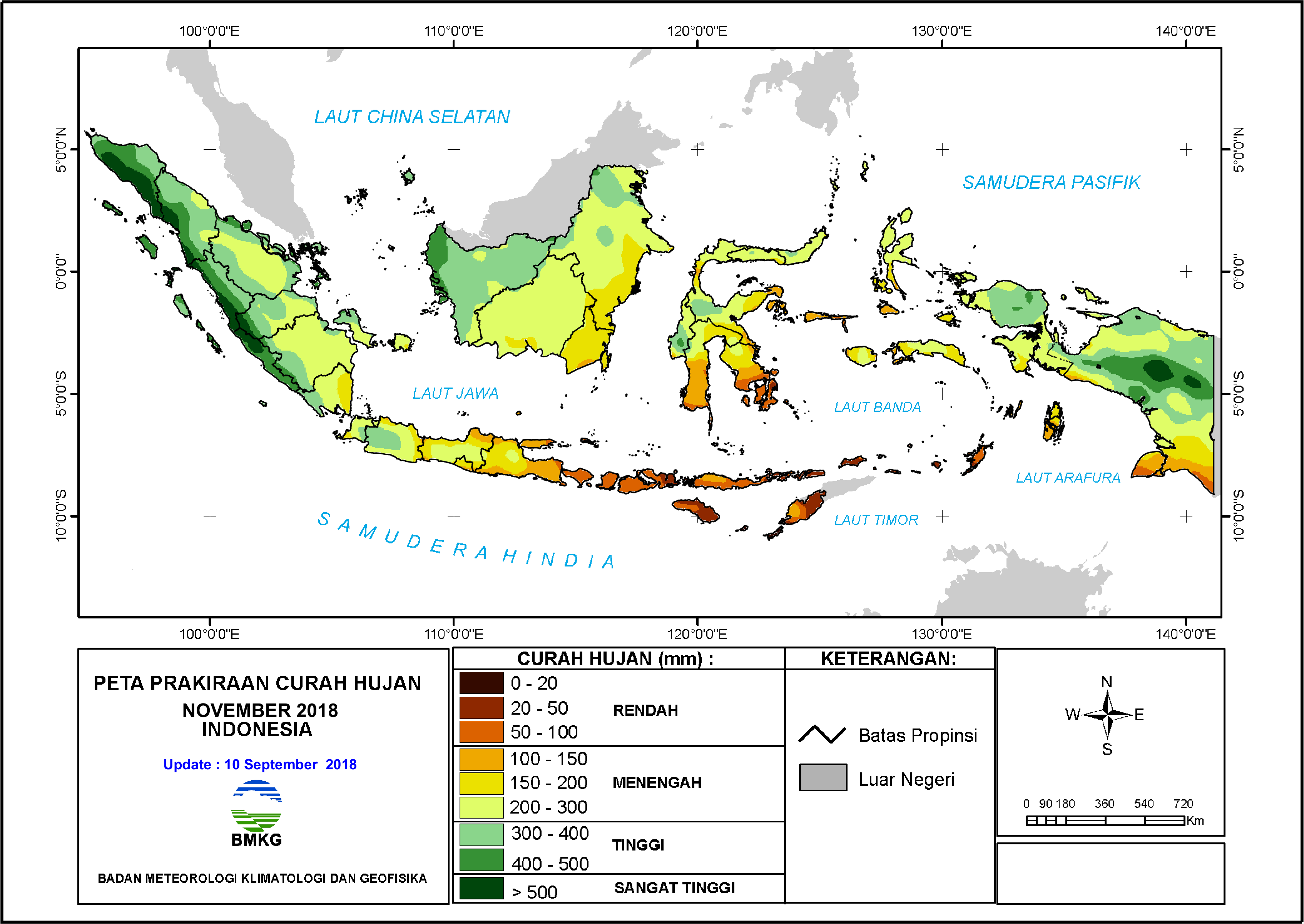 Pada Bulan November 2018, sebagian besar wilayah Indonesia diperkirakan memperoleh curah hujan yang menengah hingga tinggi, kecuali wilayah-wilayah Sulawesi Tenggara dan Nusa Tenggara.