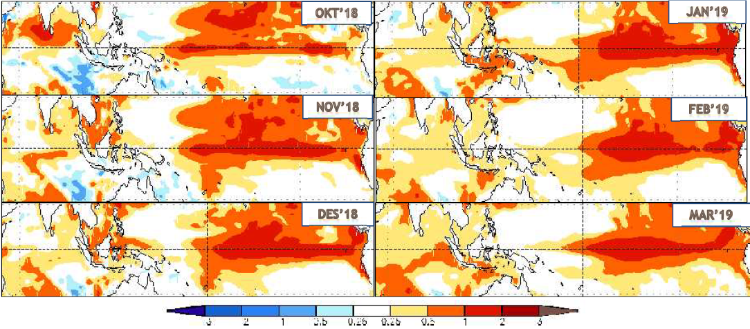 Berdasarkan hasil pengamatan anomali suhu muka air laut yang dilakukan oleh Bureau of Meteorology Australia, diketahui bahwa sebagian besar perairan Indonesia mempunyai suhu yang lebih rendah dibandingkan Samudera Pasifik. Kondisi tersebut tentunya akan menyebabkan adanya aliran massa uap air dari Indonesia ke Samudera Pasifik. Secara proses, kondisi ini dikenal dengan fenomena El Niño. Namun demikian, tidak berarti serta merta akan terjadi El Niño pada beberapa bulan kedepan. Hal ini karena fenomena El Niño pada musim penghujan (Oktober-April) sangat jarang terjadi sebagai akibat adanya kompleksitas dan banyaknya faktor yang mempengaruhi dinamika atmosfer, khususnya di Indonesia.