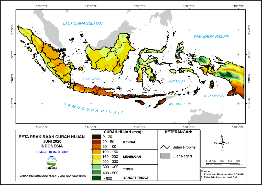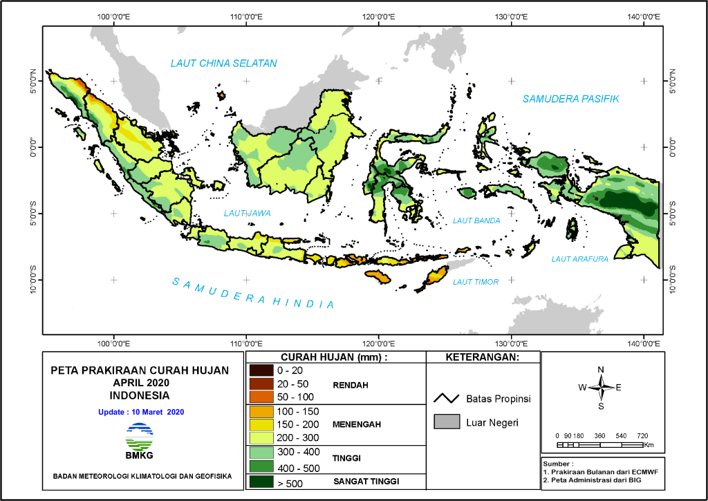- Curah hujan tinggi (> 300 mm/bulan) pada April 2020 akan terjadi di Kalimantan Barat, Kalimantan Tengah bagian utara, Kalimantan Timur bagian barat.