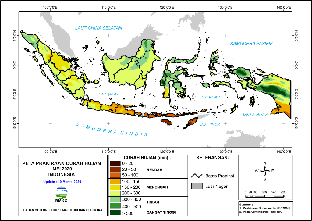 Pada bulan Mei 2020, diprediksikan curah hujan bulanan di sebagian besar Sumatera berada pada level menengah dan cenderung memiliki nilai curah hujan yang berkisar 100-150 mm/bulan. Sementara itu, curah hujan bulanan di sebagian besar Kalimantan juga pada level menengah dengan kisaran curah hujan 150-200 mm/bulan.