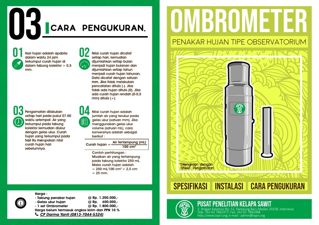 Guna mendukung pencatatan dan pengumpulan data yang tepat dan akurat, kami memperkenalkan salah satu produk kami yaitu alat penakar hujan manual (ombrometer). Alat tersebut telah terkalibrasi, telah teruji selama puluhan tahun, dan telah digunakan di banyak kebun milik sendiri (PPKS), BUMN, maupun swasta yang tersebar di seluruh Indonesia. Ingin mengetahui lebih lanjut mengenai spesifikasi dan cara kerja alat tersebut, silakan lihat leaflet di bawah gambar alat Ombrometer PPKS.